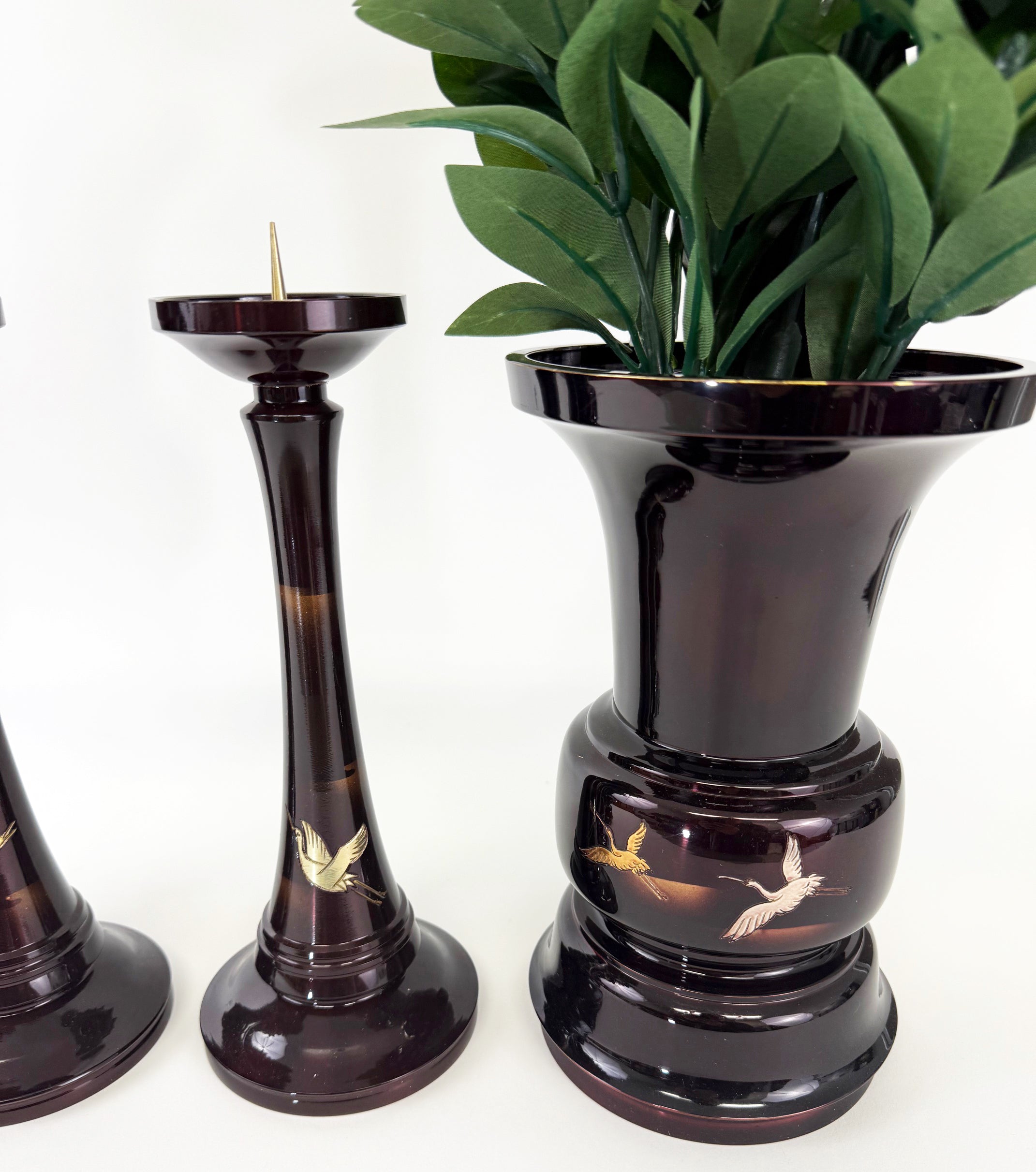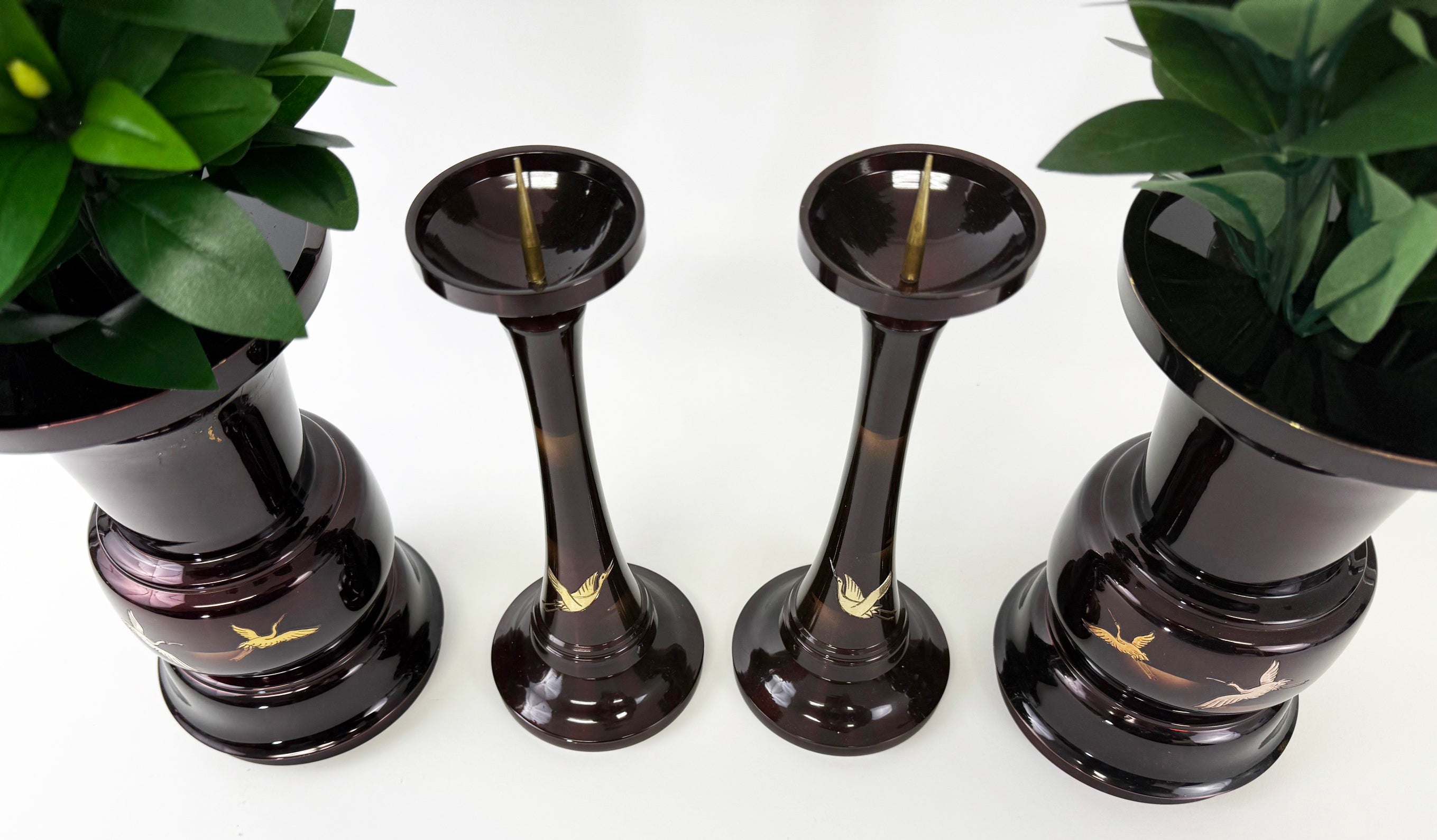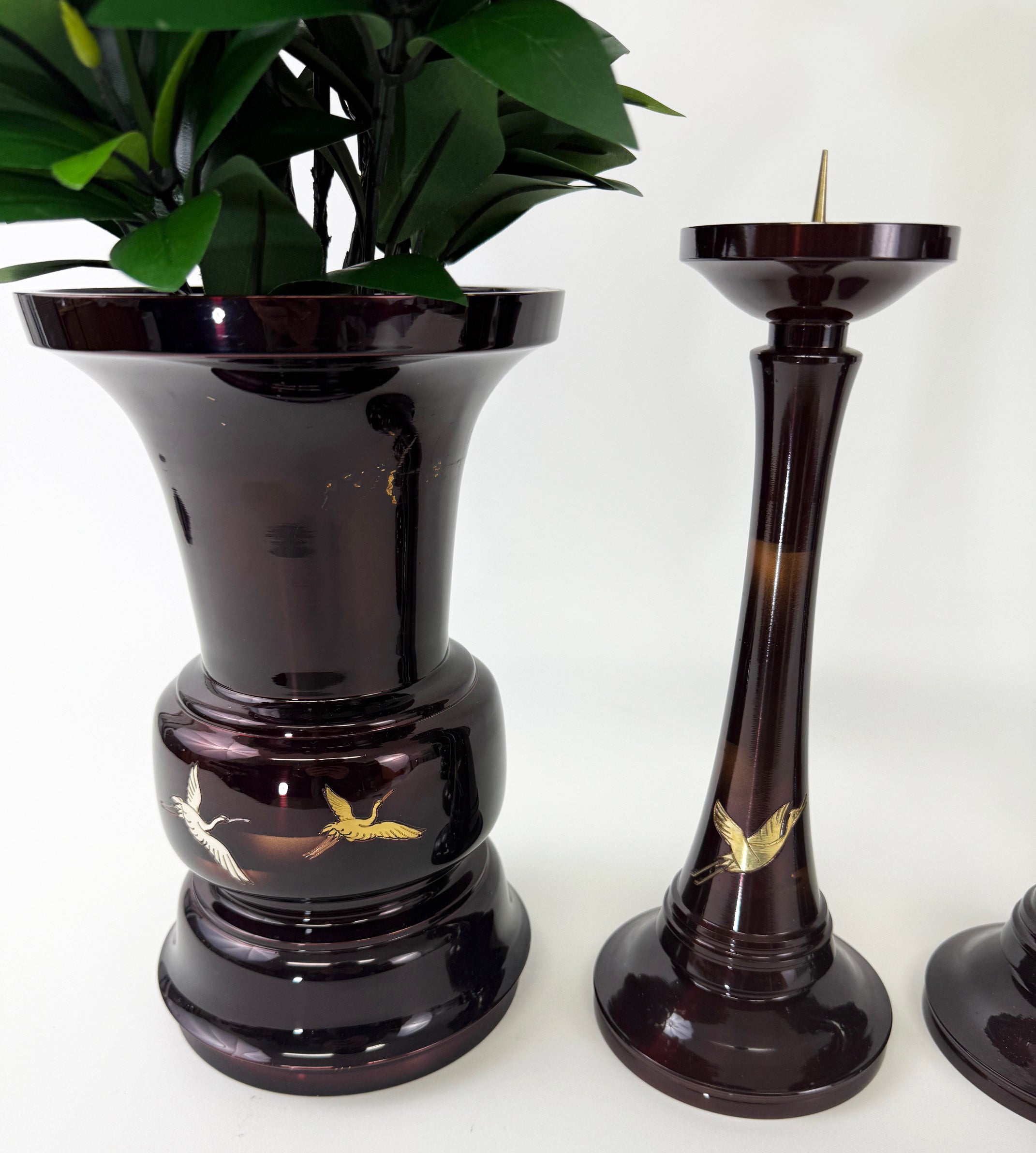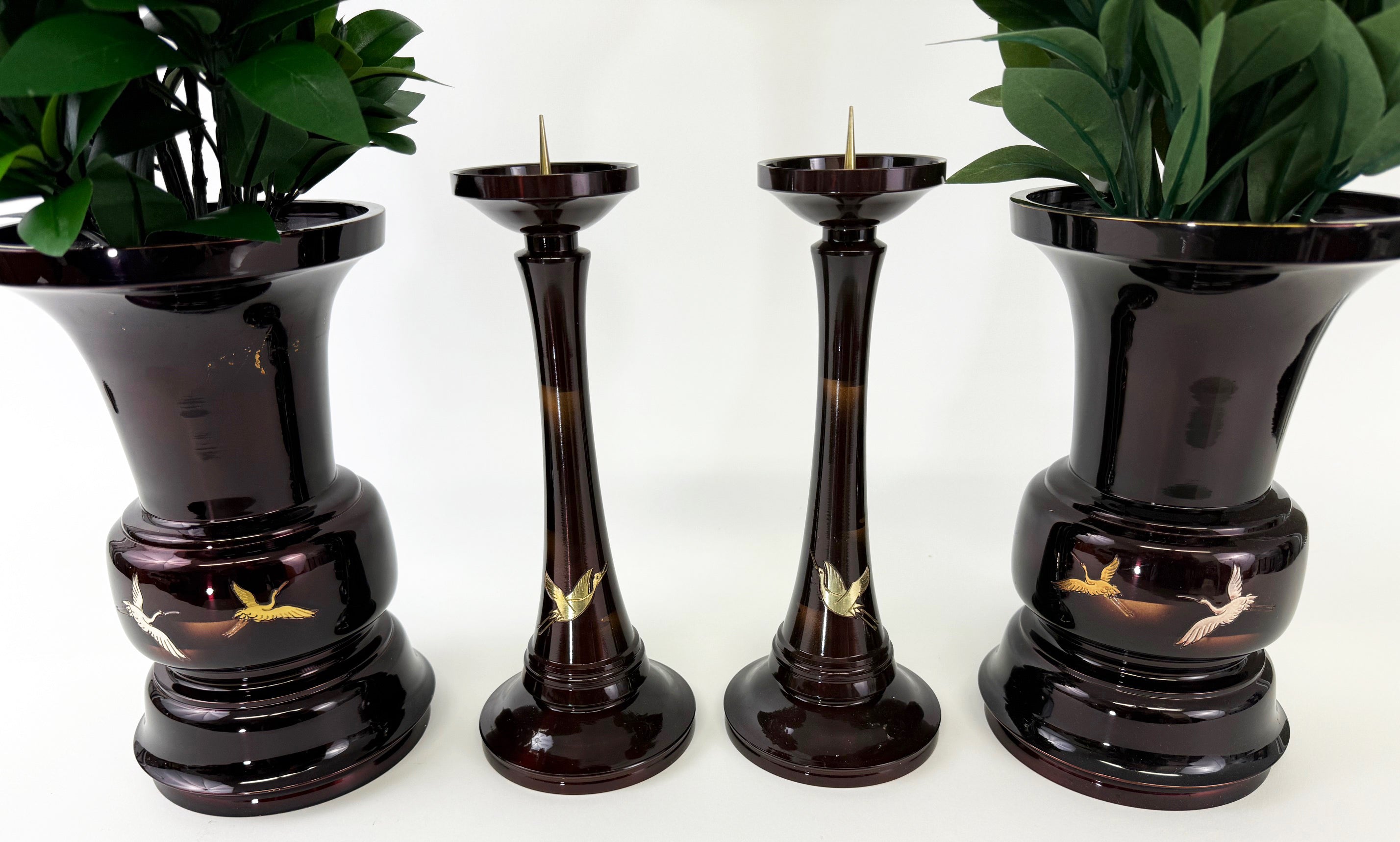 Vintage Premium Large 4 Piece Dark Cherry Burgandy Colored Butsugu Set with Flying Crane